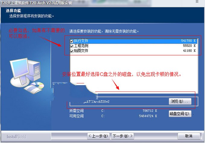 2.上方的勾选功能全部都是必要的,在下方的安装位置建议不要选择C盘,以免出现电脑卡顿的情况。
