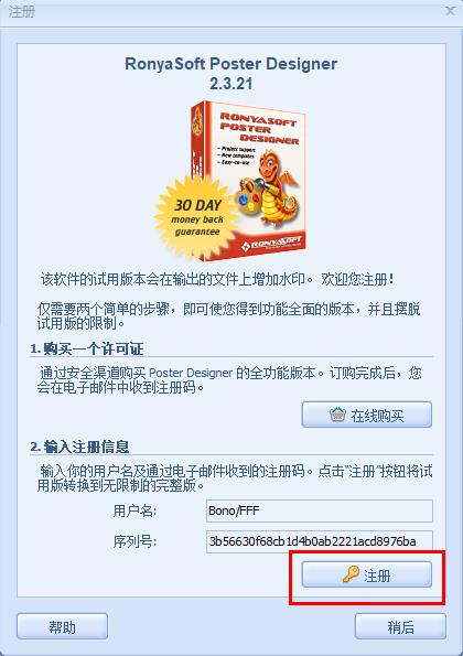 RonyaSoft Poster Designer1、运行软件,进入软件界面,弹出注册窗口,将软件包中的注册信息复制到注册界面,点击注册。