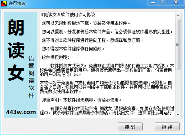 1、在本站下载朗读女免费版安装包,解压缩并运行主程序开始安装,许可协议点击接受