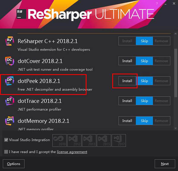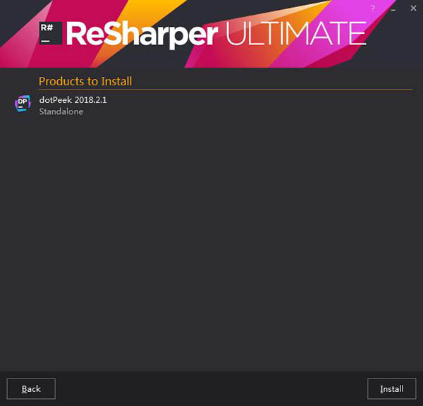 JetBrains dotPeek2018.2.11、下载软件包解压,双击运行“JetBrains.ReSharperUltimate.2018.2.1.exe”安装软件,勾选下面的选项选择我已阅读并同意协议,选择第三项,点击install安装软件。