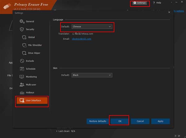 2、点击User Interface ,在Language栏选择语言,选择Chinese中文,点击OK确定,就可以设置为中文。