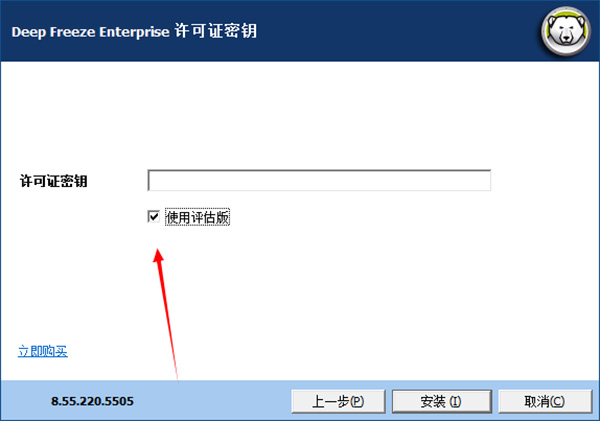 3、需要输入许可密钥,勾选使用评估版,点击安装;