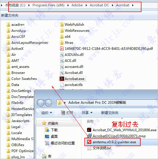 8、更新结束后,将破解文件“amtemu.v0.9.2-painter.exe”复制到软件安装目录下运行默认安装目录【C:Program Files (x86)AdobeAcrobat DCAcrobat】