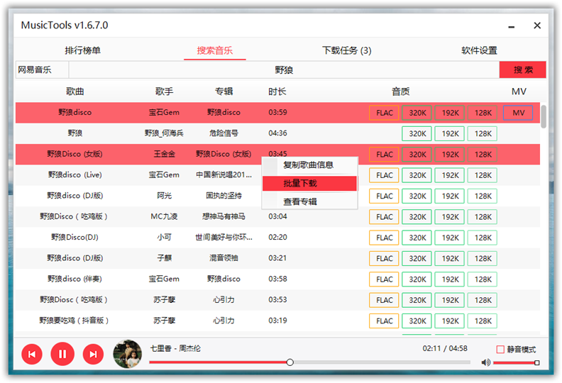 4、支持下载网易云音乐64k、128k、198k和320k码率的音乐;