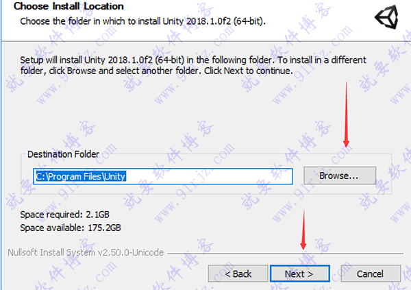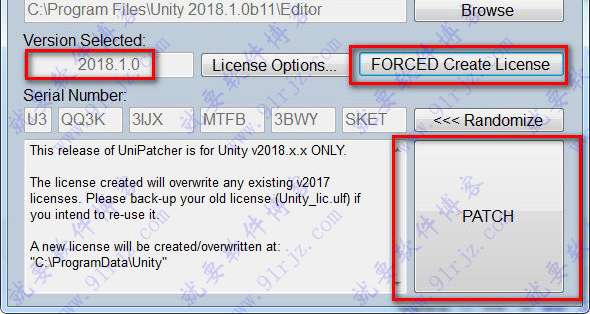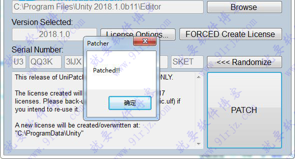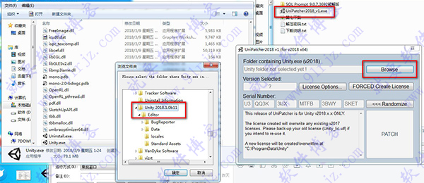 6、安装完成后,运行“Unity 2018破解补丁UniPatcher2018_v1.exe ”,首先点击“Browse载入安装目录,如默认文件夹为C:Program FilesUnity 2018.1.0bf2Editor