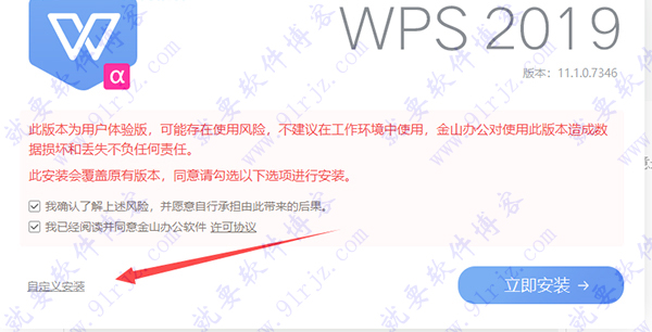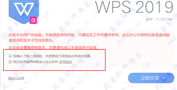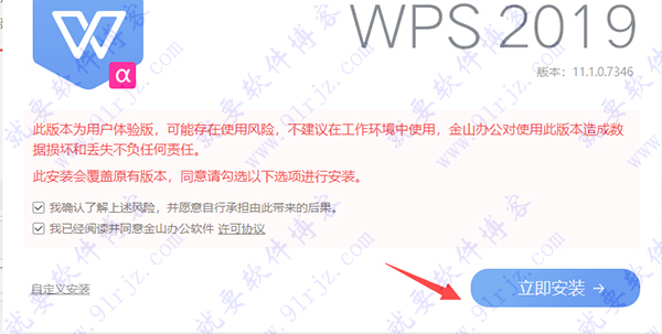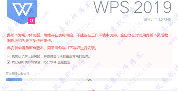 1、在本站下载并解压,双击WPS_alpha1.0.exe运行,如图所示,勾选我确认了解上述风险,并愿意自行承担由此带来的后果和|我已经阅读并同意金山办公软件许可协议