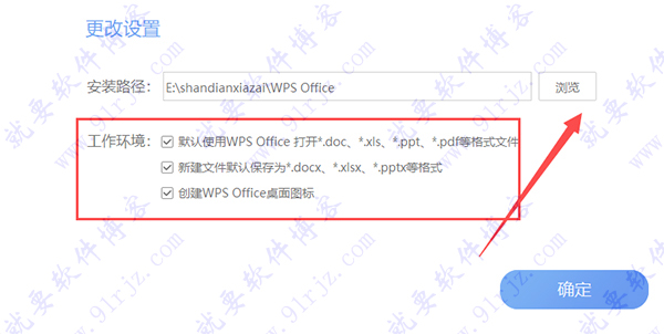 3、点击浏览按钮选择安装路径E:shandianxiazaiWPS Office,并勾选工作环境,默认全部勾选即可,点击确定