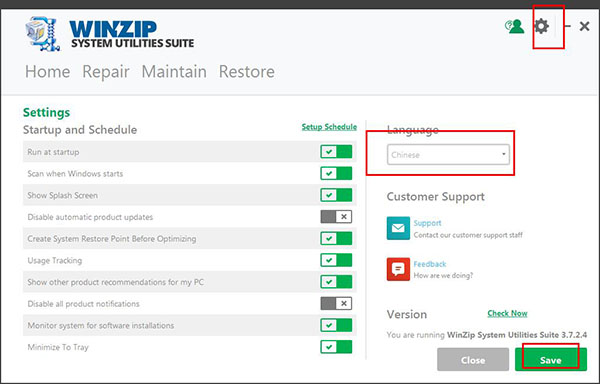 1、点击软件界面右上角的设置按钮,在language栏选择语言,选择简体中文,点击save进行保存。