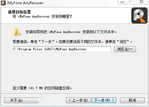1、下载iMyFone AnyRecover中文破解版软件包解压,运行exe程序安装软件,选择软件安装目录,点击下一步。