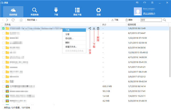 下载和管理自己网盘的文件目前,速盘对百度云盘的管理支持下载,新建目录,移动和删除,创建分享。要实现对自己网盘的管理,必须登录百度账号。