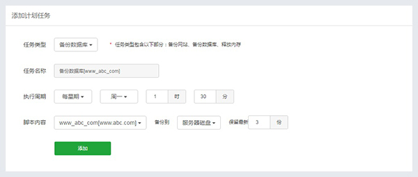 计划任务可按周期添加执行,支持SHELL脚本,提供网站、数据库备份以及清理内存。