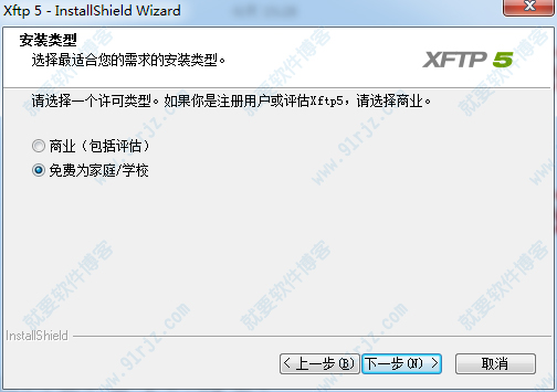 2、Xftp 5可分为两个版本,分别是商业版(包括评估)和免费版(家庭/学校),小编这里可选择免费版安装
