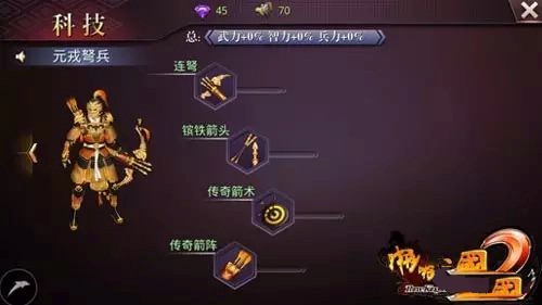 在游戏中,玩家需要消耗特殊道具“科技锤子”,对兵种进行升级。“科技锤子”可通过攻略副本、完成任务、升级奖励等方式获得。如下图所示,玩家可以升级士兵的武器(增加武力)、盔甲(增加兵力)、技能(增加武力和智力)和阵型(增加对克制兵种伤害)。