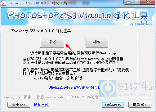 2、解压之后,软件会自动弹出photoshop cs3绿化工具,选择【绿化】按钮