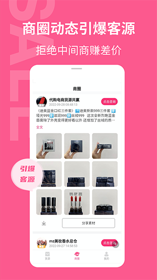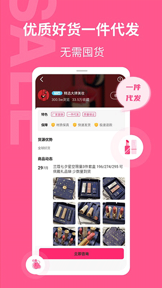 1、下载安装后打开软件,可以看到有各种各样的美妆货源,支持一件代发以及厂家直供。2、选择自己感兴趣的货源,可以看到发布的商品动态,点击立即咨询即可开始与商家沟通。