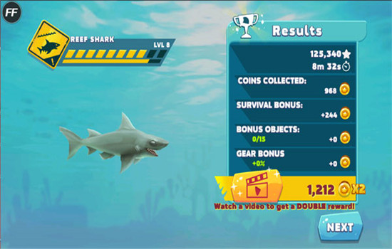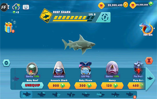 4、完成50个任务,寻找宝物取得金币与宝石,用来升级你的鲨鱼或者购买特殊救生道具。
