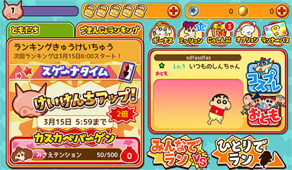 这次活动的内容是在跑酷过程中得金条,得四百根金条就有一个特工造型的小新,当然还有其他奖励,就是金币,钻石,皮肤,亲友团。前面讲了钻石和金币很难获得,但这个活动给的很大方。