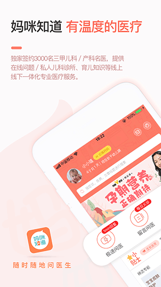 妈咪知道独家签约北上广深等全国9大重点城市三甲级医院产科、儿科医生,在线候诊、随时响应,解决妈妈和宝宝的健康问题。