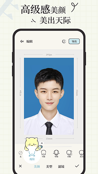 一键匹配干净自然妆容,智能美颜。可选择伪素颜妆、元气妆、女神妆、男神妆等多种妆容风格,提升照片质感,还原美貌不是梦!从此自信应对各种证件照场合。