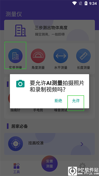 2、如果需要测量实景的数据,点击首页的实景测量,然后点击允许,拍摄要测量的物体的视频以及照片。