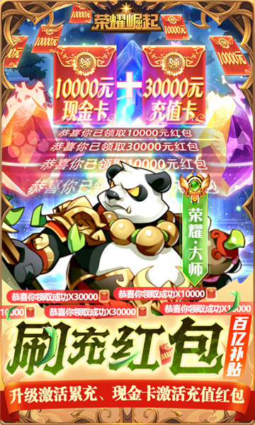 1、【创角福利】荣耀崛起变态版创角即送荣耀刷充器,余额无限存入,5星圣骑士开局,再送100元提款余额、满级VIP30、钻石*88888、金币*588888、经验水晶*5888882、【等级红包】升级累计可领10000元现金卡(可激活累充活动)