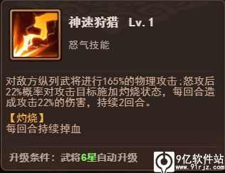 最后一个就要介绍大招啦~怒气技能:神速狩猎!对敌方纵列武将造成物理伤害,同时有概率给其施加灼烧效果。