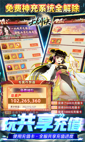 【共享充值】:一人得道,鸡犬升天,一人使用充值卡,全服共享充值进度,绝版武器、时装、元神、修仙材料应有尽有
