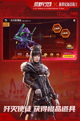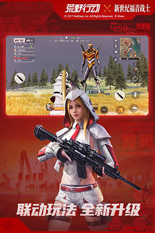 2019年5月31日,《荒野行动》上线与《新世纪福音战士》联动推出的限定玩法“使徒袭来”。在EVA限定玩法中,每局游戏由20名玩家降落在飓风半岛地图携手作战,在限定的区域内使用枪械迎击第六使徒,弹药将会在区域内刷新!在游戏中,大家可以化身为适格者,召唤初号机、零号机作战!