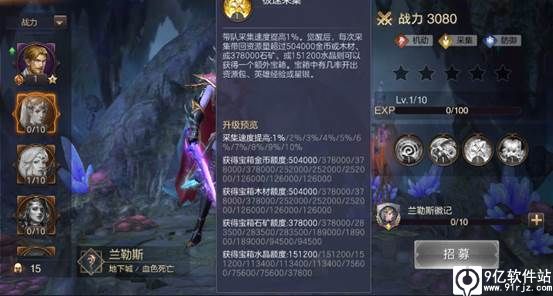 兰勒斯满星后加所有采集速度百分之十,当采集到了一定的数量会获得额外的宝箱,随着技能等级的提高,要求采集到的资源数量也会降低,兰勒斯是比较全能的采集英雄,百分之十的采集速度,是其他采集英雄不能比的,作为采集英雄是最优秀的。
