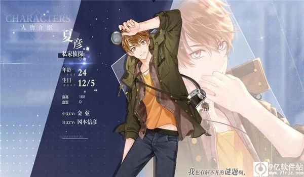 夏彦表面上的身份是未名市私家侦探,实际则隶属于国家安全部经济与科技犯罪科,现主动申请回到未名市成为违禁药品事件的调查员,并被特派到女主与其他三位男主所在的NXX调查组协助调查,代号渡鸦。
