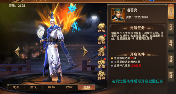 武将特色:老牌的觉醒神将,曾经蜀国的扛把子,诸葛作为一个百搭的反伤将星光环将,其辅助地位也是根深蒂固的,还拥有封印技能的将星,其在蜀国魔神中也有不错的表现,但因没有聚怪能力,在出奇制胜中更多的是用来打上古傀儡。