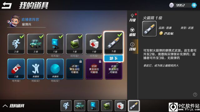 但地图虽小,道具却一应俱全。首先来看场外因素,玩家达到黄金段位一共可以解锁十二种道具,但上场时只能携带6种道具,包括皮卡、医疗箱、火箭筒等等,道具都可以进行升级。这里除火箭筒以外其他功能不分角色。