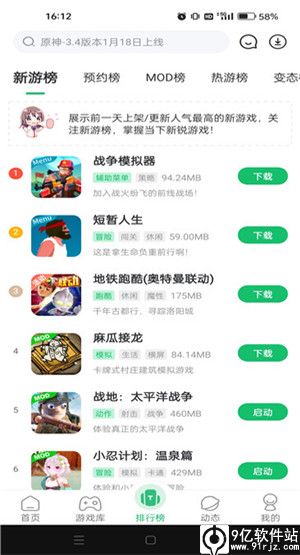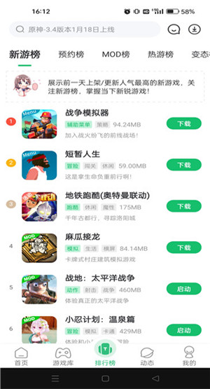 排行榜分为新游榜、预约榜、MOD榜、热游榜、变态榜等等,都是展示前一天人气最高的新游戏哦