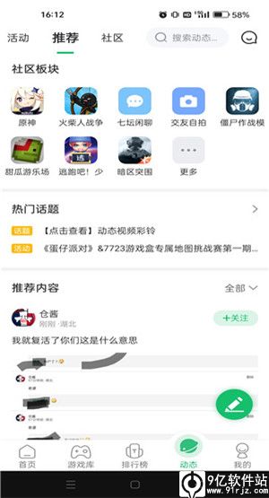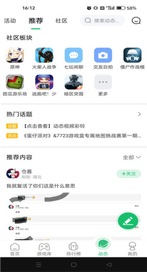 7723游戏盒正版的动态功能区分为了社区板块、热门话题和精选内容,诸多小伙伴在这里分享自己的游戏乐趣