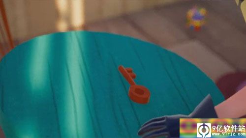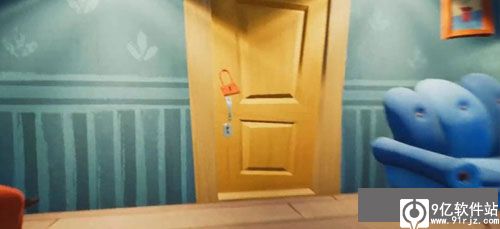 7、拿到蓝色桌子上的钥匙,去往一楼客厅,打开蓝色沙发旁边的黄色门,进入地下室。