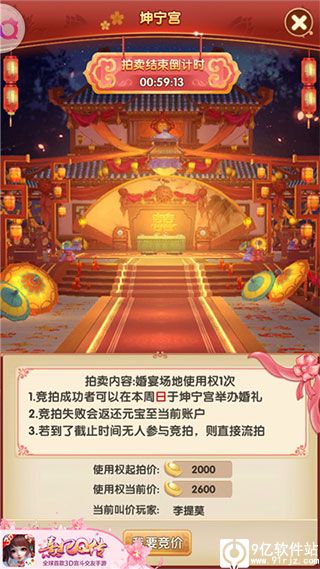 每周六的9:00~21:00即为婚宴竞拍时间,竞拍成功者可以在当周周日20:00~20:50于坤宁宫举办婚宴,竞拍失败会返还所有元宝。婚宴场地使用权1次的起拍价为2000元宝,小主们务必看准时机再下手,若有幸一举拿下,那可千万别辜负良辰美景、好酒好月哟!