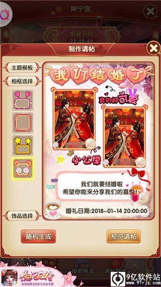 拍完婚纱照,用成片制作一张美美的个性请帖,将小两口的幸福展示给各位亲友。月老祠为小主们提供了多种主题模板、相框以及饰品,少女心大满足!想他日两位新人手牵红线,于姻缘树下盈盈浅笑,定是所有宾客都无法遗忘的风情了。