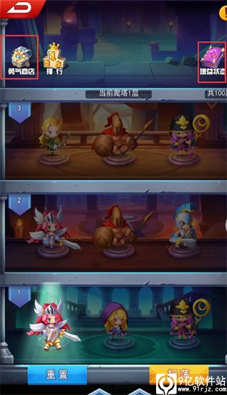 游戏中产出装备的主要产出非试炼之塔莫属,试炼之塔每层塔有3个boss,每个boss都有3种难度进行选择,打过对应难度boss可以获得相应的星星,星星可以在每一层打完之后选取buff。打败boss可以获得勇气币,同时每打5层可以获得一个宝箱,宝箱首次打开会出完整的装备,之后每天都有1次免费的重置试炼之塔的机会,重置之后玩家在开宝箱会获得随机的武器碎片。右上角是勇气商店,左上角则是可以观看已经获得的所有增益效果。