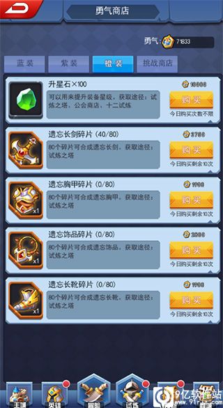 在试炼之塔中获得勇气币之后可以在勇气商店购买武器碎片和升星石。蓝装,紫装中购买装备碎片是没有次数限制的,只要你有勇气币你就可以无限买买买。橙装的装备碎片每个部位每天限购次数为10次。挑战商店是需要达到对应的层数才可以开启购买,每个装备仅能购买一次,但是这里所需消耗的勇气币同类装备要比其他商店都要低很多。