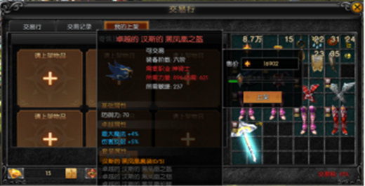 出售(我的上架)界面和购买界面则是完全不同了。在我的上架界面,左侧为自己上架的道具,右侧为背包内可上架道具。一定要是非绑定显示为可上架的道具才可以上架,并且上架是存在数量限制的。