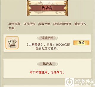 传功房内可以查看本门派是否能学习炼丹,炼器,阵法,有无门派秘籍。一般来说有秘籍的门派才值得在内常驻,如果当前门派全部毕业,建议选择有炼丹术的门派挂丹方。