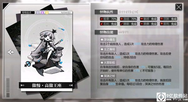 这是一位诞生于人类心中的怪物,在魔女境界中获得能量并且实体化,是所有罪恶中最危险的存在。在战斗过程中,面对傲慢·王座时比较让人头疼的就是其技能中【深渊之杖】的回复能力。