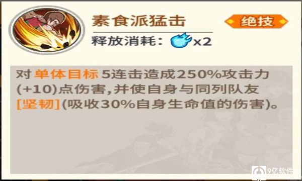 在协会竞技中,背心素食派由于自身绝技伤害过低,所以不需要施放绝技,他的被动技能配合极限甜心假面或者背心等带有【坚韧】效果的角色有着质的飞跃;