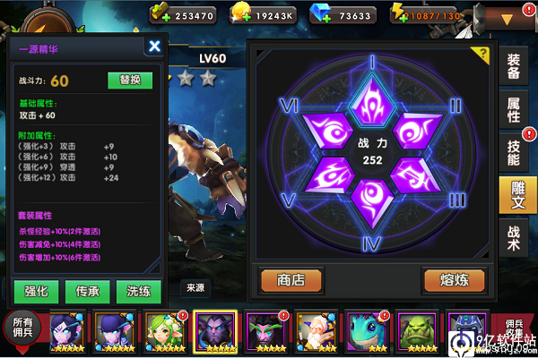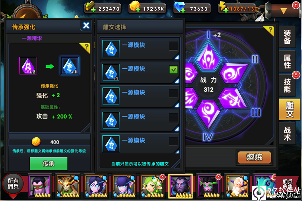 当玩家的领主等级达到25级,将会开启“雕文”系统,雕文是提升英雄属性的主要道具。通过“佣兵”打开英雄面板,我们可以进入“雕文”选项,在界面中我们看到整个雕文系统包括镶嵌位、属性面板、功能按钮三个部分。