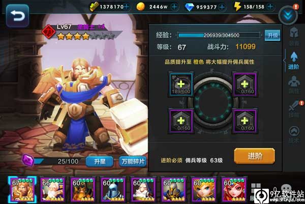 佣兵进阶需要对应种族的建筑、佣兵等级、强化精粹、晶石(精粹和晶石可通过副本获得)