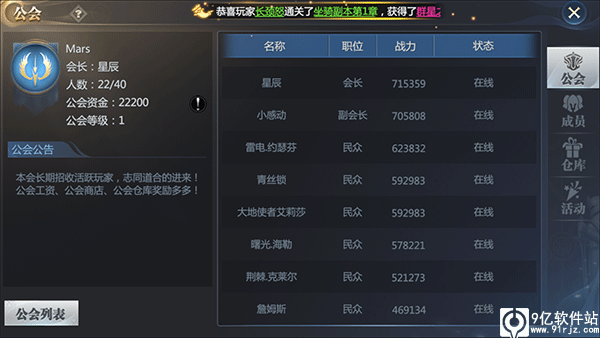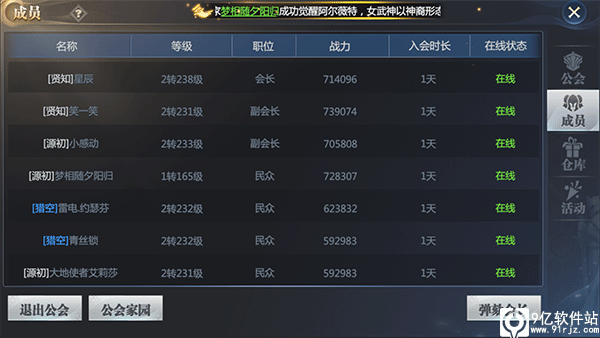 公会职位:公会职位分会长、副会长、精英及普通成员。其中会长、副会长和精英有清理公会仓库的权限。