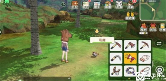 1、首先需要准备一个绳索,然后在【朝晖森林】中就可以找到很多鸡,可以点击右侧的"双向箭头"使用喇叭引起动物的注意;
