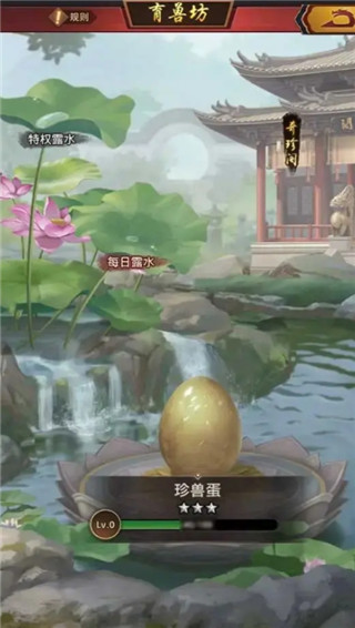 当然除了通过活动获得珍兽,只要大人您官品达到正四品,即可解锁奇珍阁内的育兽坊并获得一颗3星珍兽蛋。大人可以通过收取露珠累积升级进度,培育出自己的珍兽伙伴。