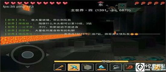 用背包里面的铁镐、斧头就可以挖石头、砍树等。游戏中屏幕左下角的摇杆可以控制角色走了,右下角自由一个跳跃按钮。