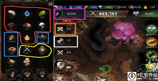 提供不同类型建筑的地方,有生产类,军事类,科技类,其中资源类为下图红色圈选处,军事类为黄色圈选处,科技类为蓝色圈选出处。这里比较重要的是蚁群数量(紫色框选),工蚁数量(橙色框选),进化菌丝(白色框选)。